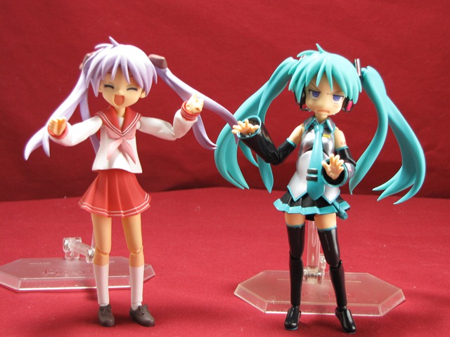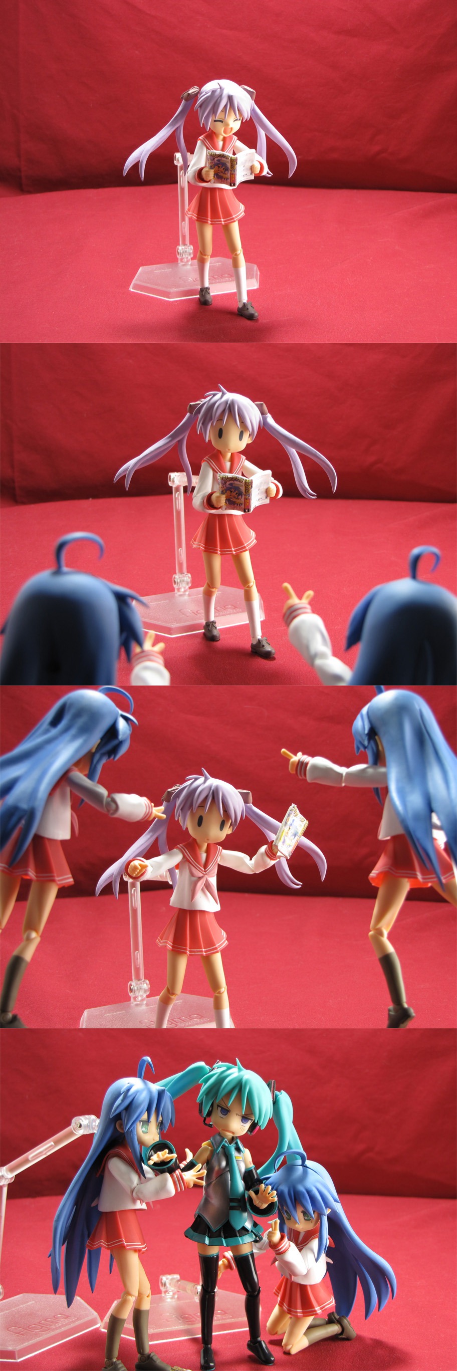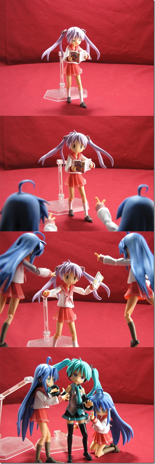 Nice use of the Tsukasa face for Kagami’s O_O right before the costume rape. I don’t think Konata cloned herself, she was just so fast with the cosrape that she left mirror images of herself lol. I’m wondering if her twin tails are swappable with the original Miku Hatsune figma’s.