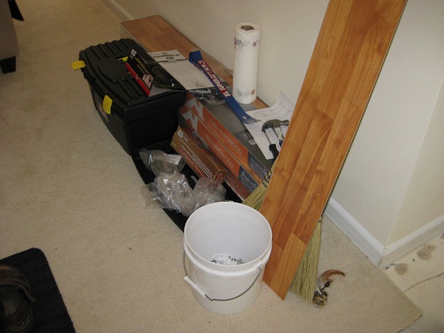 In this weekend’s standard deviation from otaku life, I’ll be installing some new laminate wood flooring in the downstairs entryway. Over the course of the past week, I’ve had to tear up the existing carpet, remove the padding underneath, and rip up the tack strips for holding the carpet in place. Once that was all done, I could start the clean up process and fill in the holes and cracks in the concrete. Lastly, I had to clean up parts of the floor with bleach cleaner to get rid of the cat urine smell that had soaked through the carpet and padding… If all goes well, I’ll have more pictures to post later this weekend. I’ll also try to document the stages of the project, time permitting.