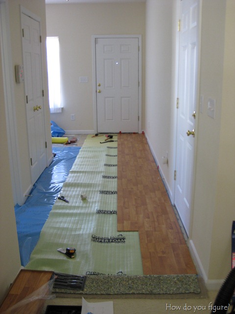 - July 3: Put down moisture barrier (blue stuff), padding (yellow stuff), and floor boards