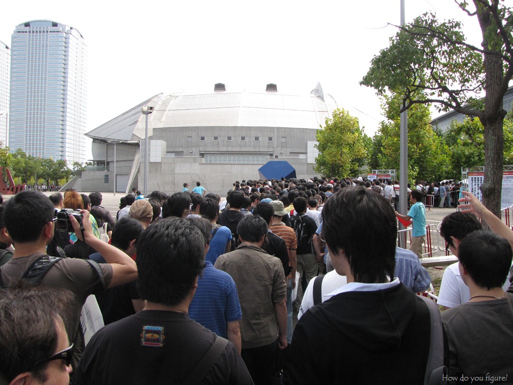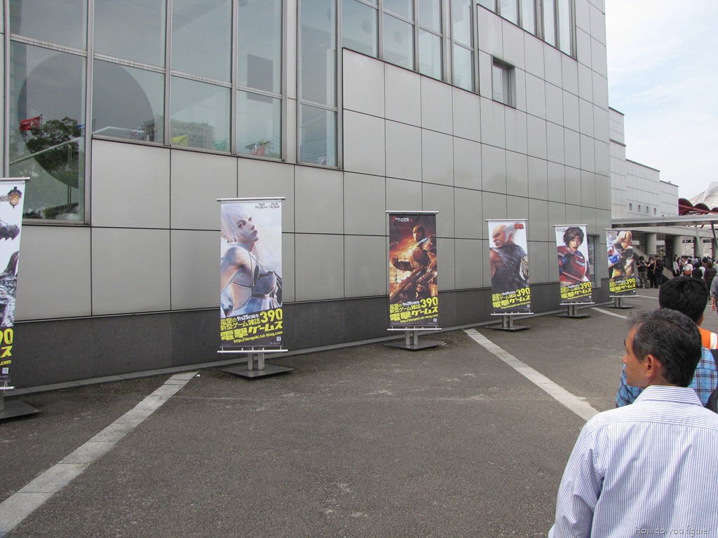 There were huge crowds the entire way going into the show. Due to the sheer volume of people, we ended up lining up outside in several groups to go to the bag checkpoint. It was pretty warm yesterday as well, with humidity up and sunny skies. Fortunately, we weren’t out there for too long (maybe half an hour at most), though you could definitely tell we were at a game convention… nearly everyone had some sort of portable game console. We kept saying that we should have brought our PSPs just to pass the time.
