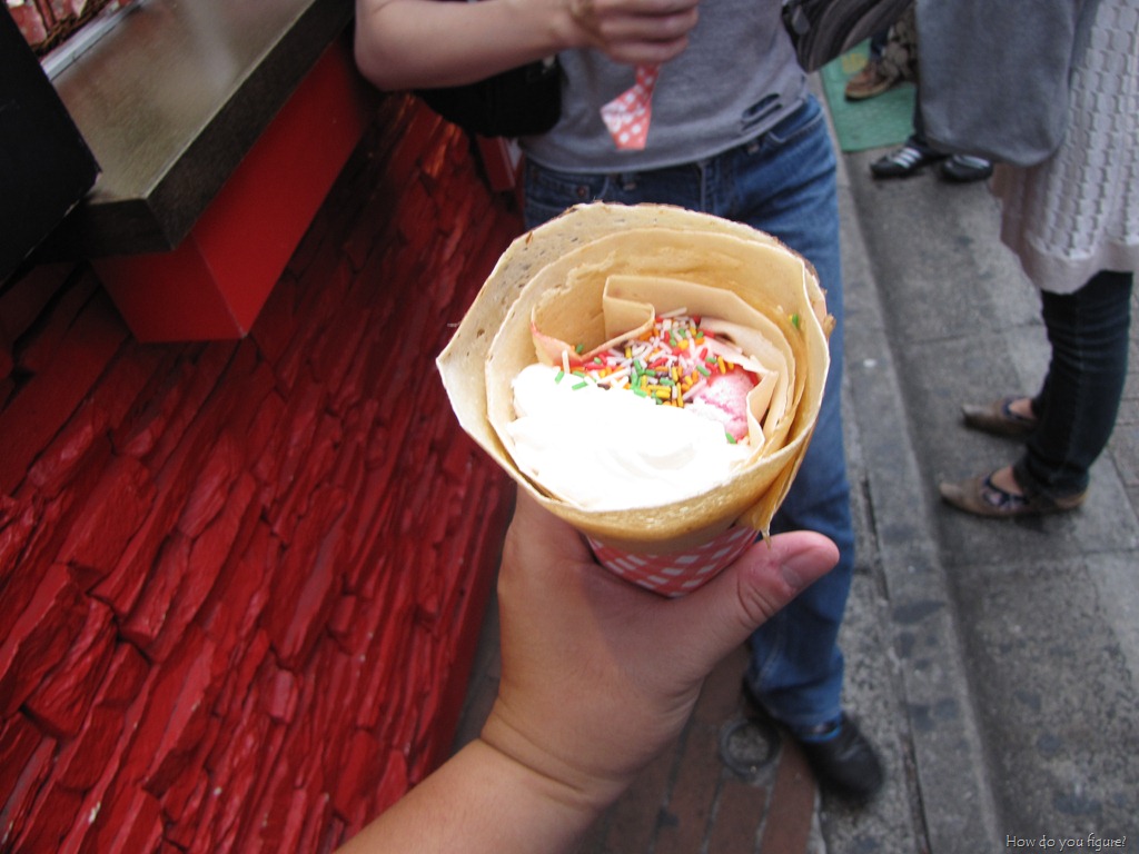 There were a lot of interesting little clothing stores (many of them featuring Goth/Loli fashion) and plenty of stands selling Crepes. We couldn’t resist the temptation and wound up with one each. I went for one with peaches, strawberry ice cream, and whipped cream. Yum yum!