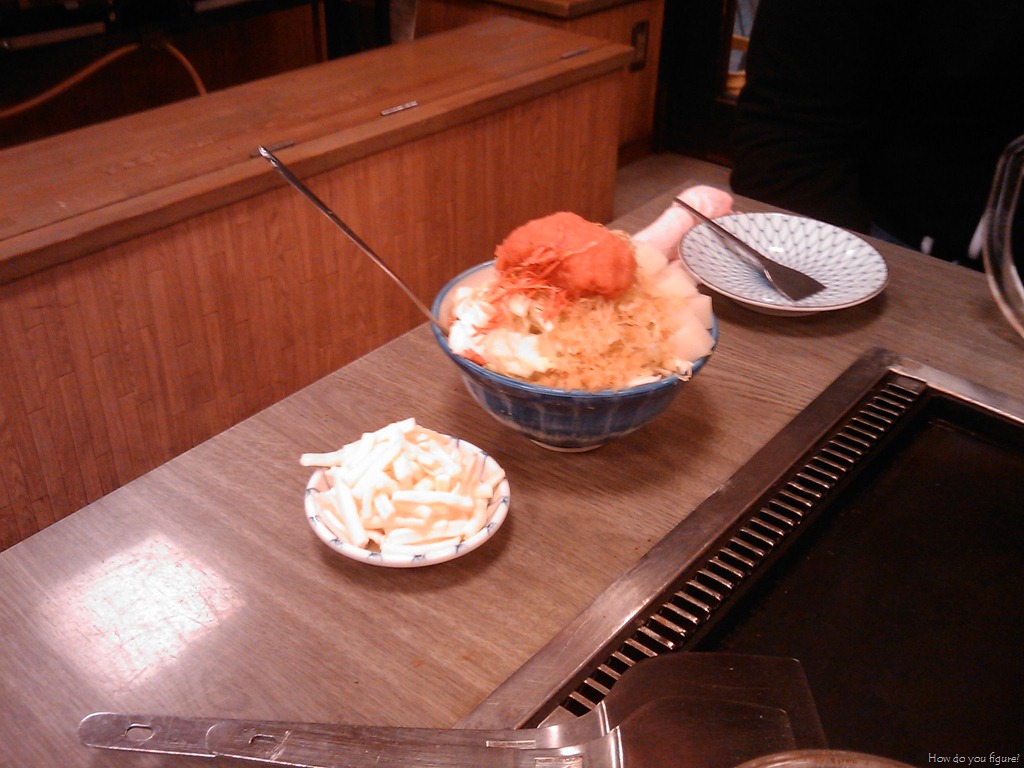 I’ve seen it plenty of times in pictures an anime, but never actually had it myself. Each table has a hotplate on it and you order bowls of ingredients that you make yourself. The traditional okonomiyaki is vegetables, meats, and seasonings cooked into a batter on the table.