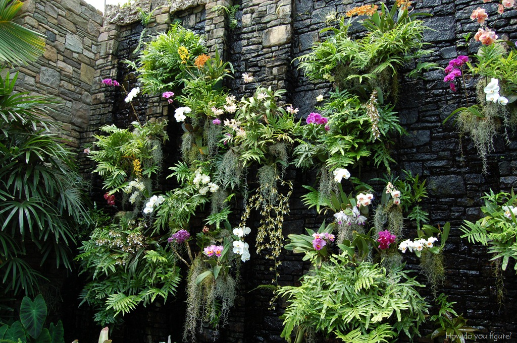 Inside the greenhouse is a variety of orchids. Some are potted and near ground level while some are hung in more elaborate displays