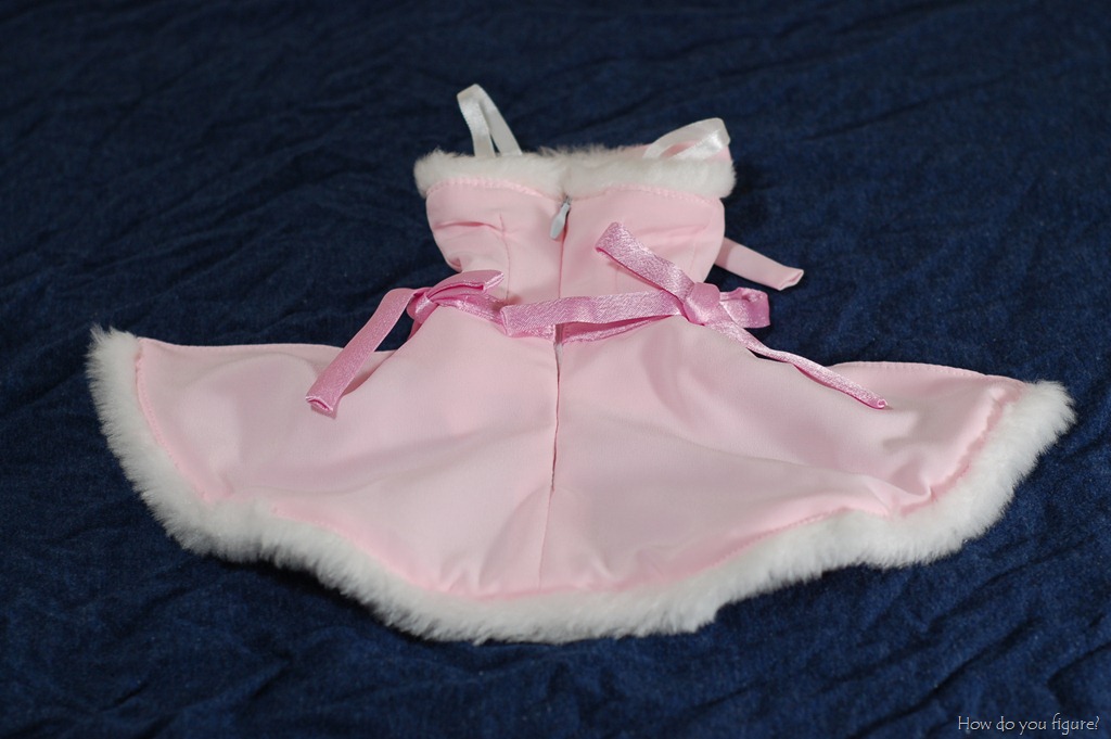 The dress has is made up of two pieces, with a top that spreads out and a simple bottom. The requisite ribbons are in the right place, along with zipper closures in the back.