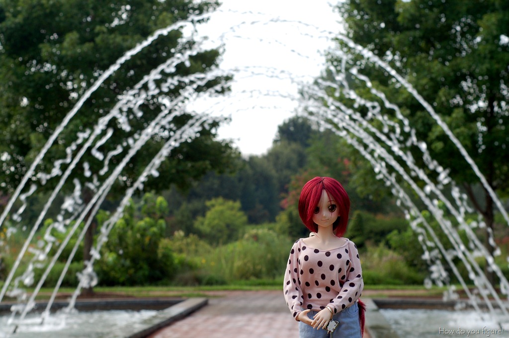 Yoko checks out an interesting warning sign… I think she’s a bit too timid to take the chance. She’ll just settle for posing in front of the fountain instead.