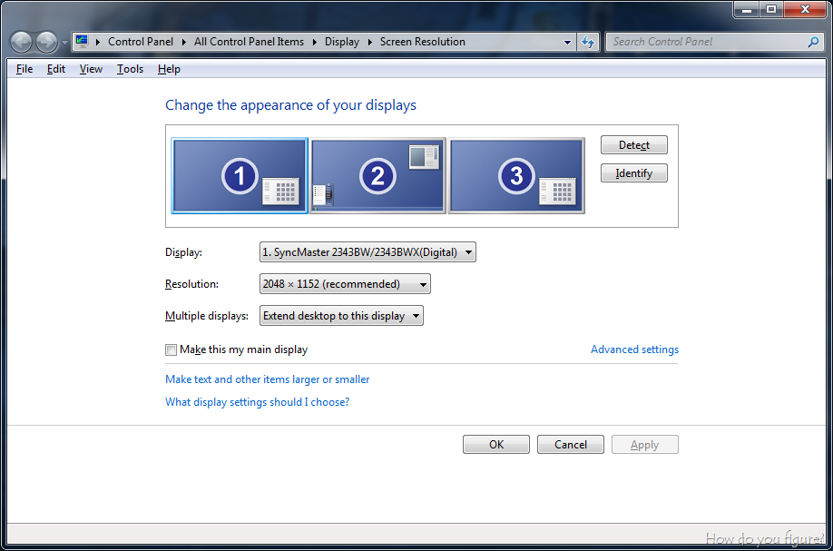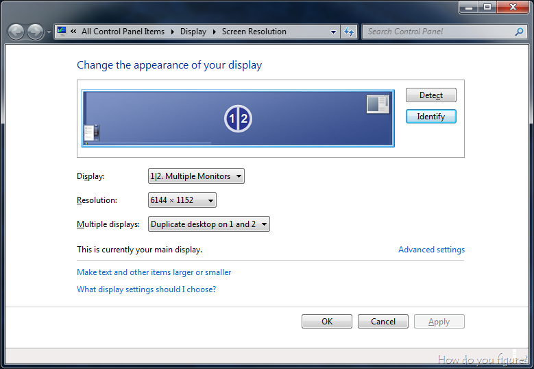 Here you can arrange the displays as they are on your desk, enable spanning across all screens, and set the main display. The main display is where your start menu and task bar will live. Keep in mind that the numbers are somewhat arbitrary, usually in the order that the GPU recognizes them. In my case, the DisplayPort screen is identified as 1. That doesn’t really matter much, as long as they are arranged in the right way here.