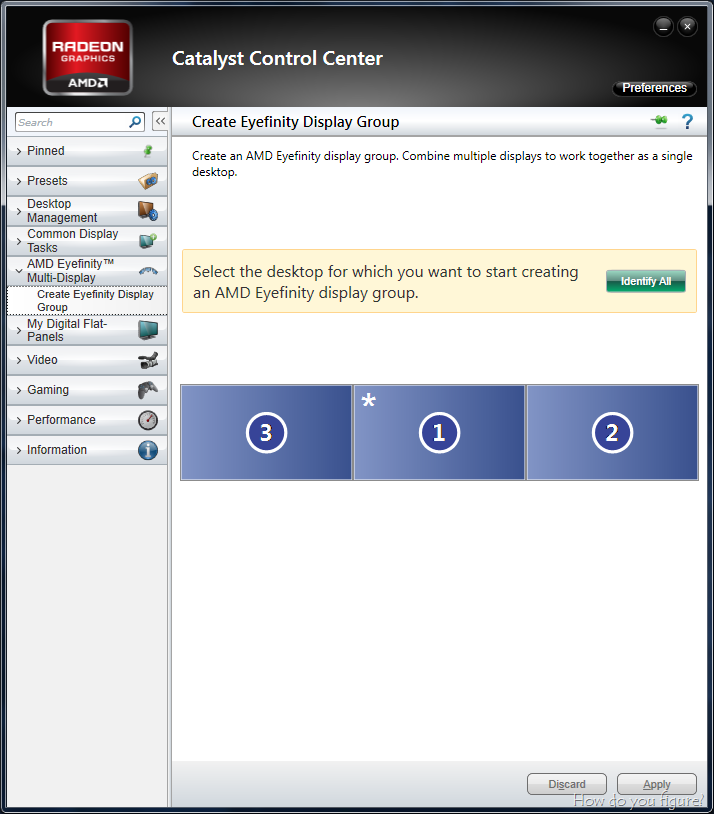 When you maximize a window in this mode, it will fill all three screens, instead of just one. To set this up, fire up the Catalyst Control Center (CCC), navigate to the Eyefinith Multi-display section, and create a group. Follow the on-screen prompts to arrange and set up the monitors the way you want them.