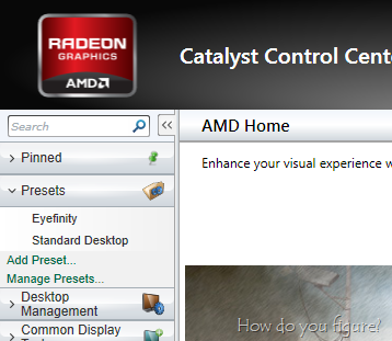 Lastly, since I usually switch between the Eyefinity setup and “standard” desktop setup quite frequently, I created some presets in the CCC. This allows me to easily go between the two via the CCC menu on the taskbar:
