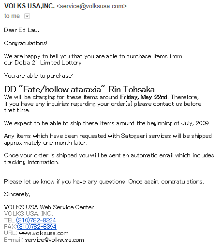 Fast forward a few months to the announcements for DollPa 21. They were planning on making Tohsaka Rin into a doll! Best of all, she would come in at an affordable ¥48,000 (Under $600 at the exchange then). At that price, I could easily justify having one, it is well under the $1000 of the Saber I saw! Plus, Rin was one of my favorite characters in the Fate franchise, so I decided I’d go for it. I had a lot to learn about buying from Volks, from the complicated lottery system to the various places you can enter. Since I hadn’t figured out the Japanese site at the time, I entered the lottery with Volks USA on May 5, 2009. Ten days later, on May 15, I got the news: I had “won” the ability to spend money.