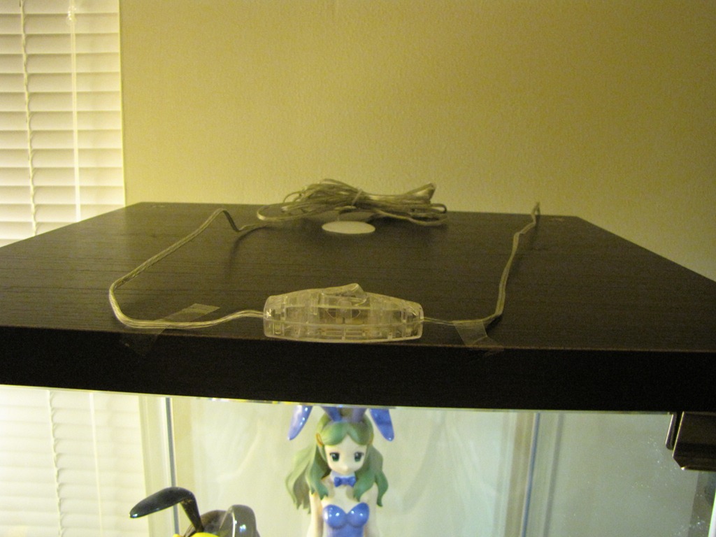 The wires for both lamps were threaded through the opening in the top then bundled up. The control switch is attached near the front of the case to allow for easy access. Finally, the power wire was run down the corner of the case and secured with transparent tape. Fortunately, the wires are semi-transparent and easy to hide against the glass. I may eventually do something with the power sources and link them together with one master switch.