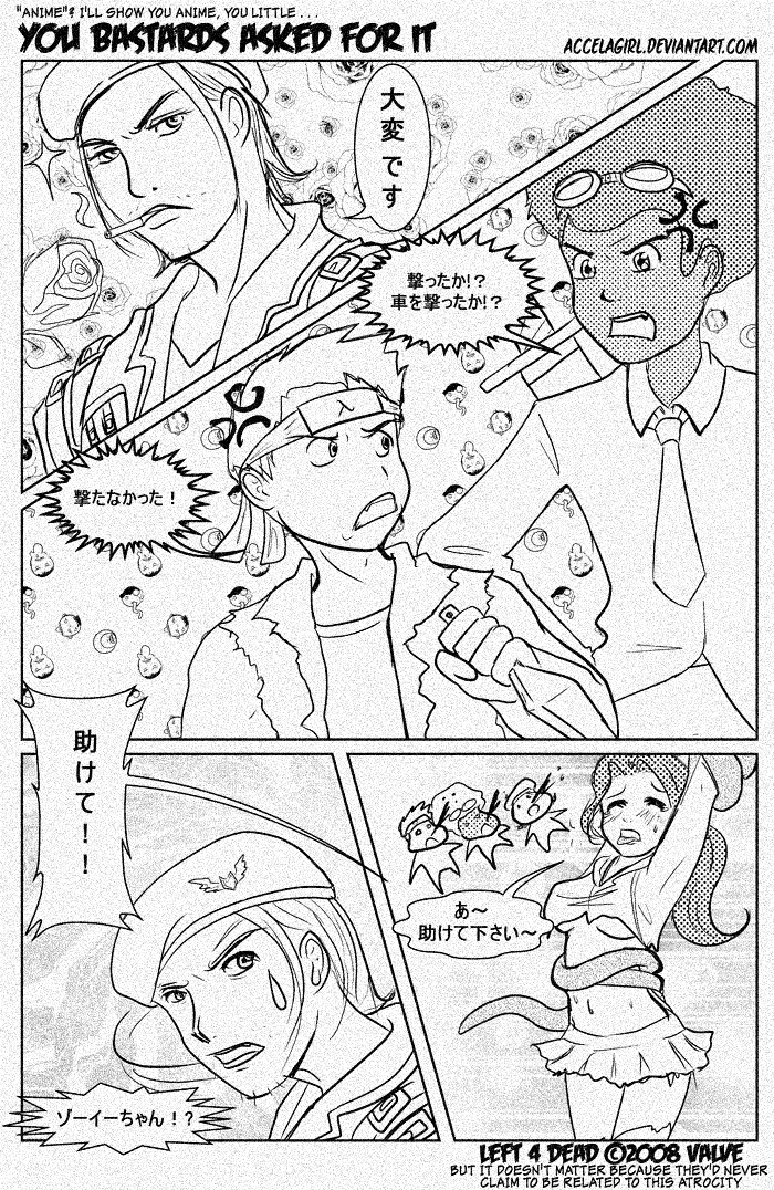 Apparently people were calling her stuff “anime” and she got tired of it. So she actually drew a manga-esque L4D comic, complete with Bishonen Bill, Afro Lewis, Ninja Francis, Boobalicious Zoey, and tentacles. Translation available here, though I’m sure you can figure out what’s being said just by the situation… That and it’s more fun to make up your own translations. 🙂
